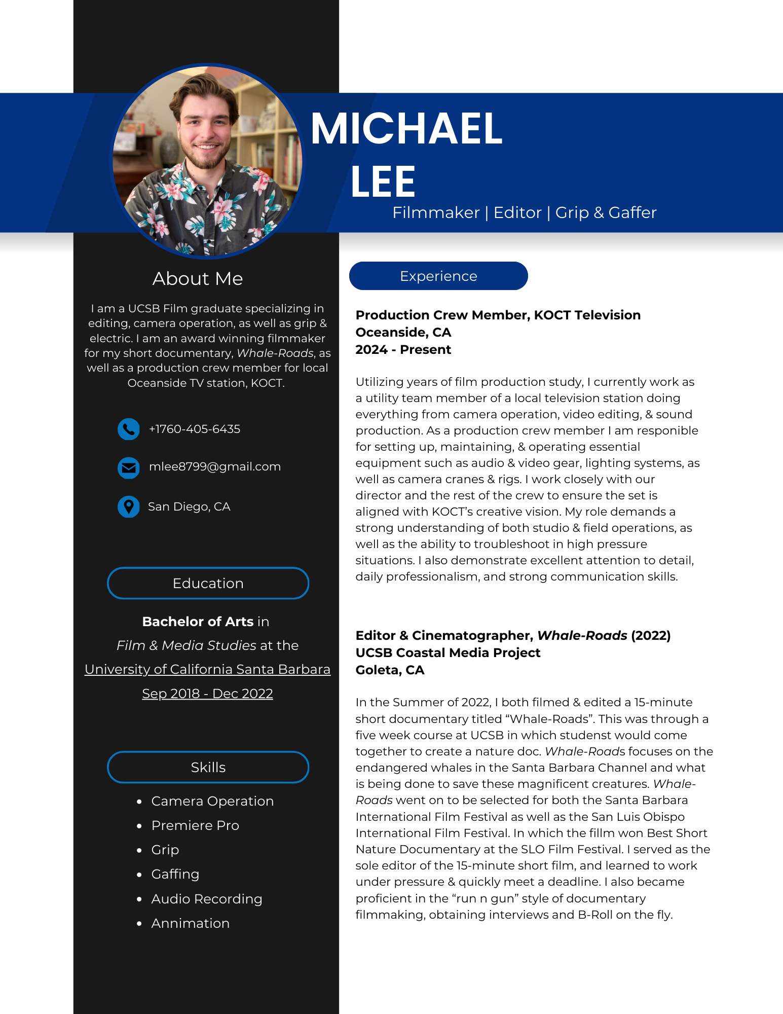 "Hello there!" My name is Michael Lee and I am a UCSB Film graduate specializing in editing, camera operation, as well as grip & electric. I also take photos & draw in my spare time, I am a creative through and through. I love comic books & video games, and I like to incorpoate my nerdom into my film projects. I'm an experienced crew member who utilizes skills in packing, setting up, and operating film & production equipment for a wide range of shoots. For in-studio productions, I put my heavy lifting skills to use to build & transform sets for a variety of television programs. Throughout my career, I've had the privilege of working on a diverse range of productions, from independent films, to live television events. In the field, I have I've honed my abilities in technical expertise & collaborative effort to allow myself to adapt seamlessly to various production environments and contribute effectively to the crew's needs. As I continue to grow my career in this dynamic industry, I am eager to connect with other like-minded individuals and explore new challenging opportunities to create art & story. If you're interested in a passionate nerd with versatile film crew experience, I'm your guy!